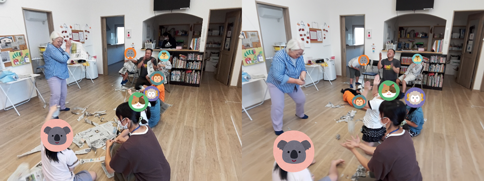 9月24日にミュージック・ケアをおこないました。今回は鳴子や鈴、新聞紙を使って楽しく取り組みました。リズムに合わせて新聞紙を破いたり身体を動かしたりして楽しんでいました。