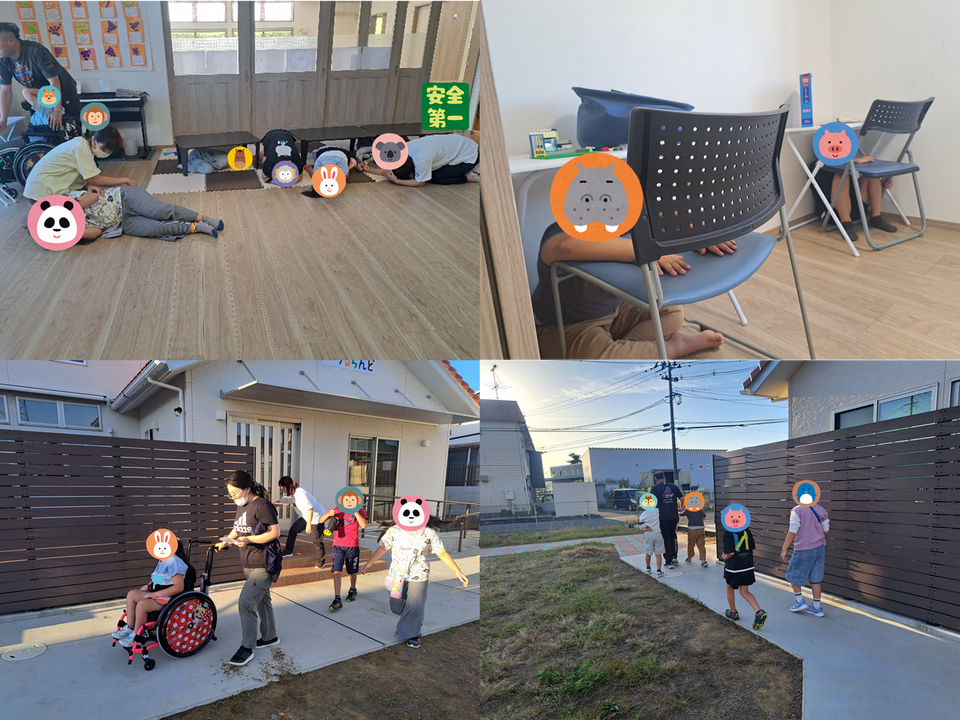 9月26日は、地震、津波が発生した際の避難訓練を行いました! 児童指導員の「地震です!」の声に、子ども達は一斉に頭を守り丸くなる“ダンゴムシポーズ”を取り、机の下へ。 児童指導員達も本気のダンゴムシになって、みんなで命を守る練習をしました。送迎車への避難も、靴を履いて、手をつないで、落ち着いて行動できました。 訓練後には「地震ってこわいけど、ちゃんと逃げればだいじょうぶ!」という声も聞かれ、頼もしい姿に児童指導員も感動しました。