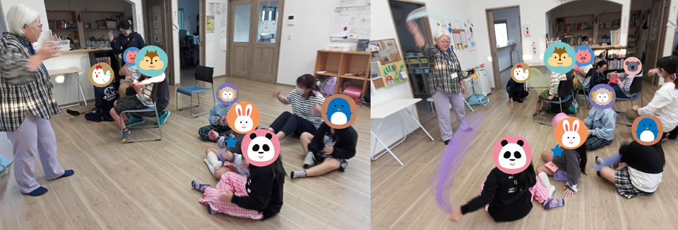 10月15日と29日にミュージック・ケアをおこないました。今回は新体操などで使うリボンやスカーフを使って楽しく取り組みました。リズムに合わせてリボンを揺らしたり、身体を動かしたりして楽しんでいました!