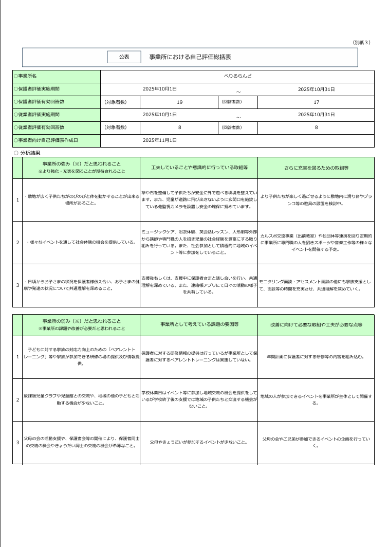2025年11月 3日 令和7年事業者向け評価表及び保護者向け評価表の結果です。 従業者評価表(べりるらんど).pdfをダウンロード 総括表(べりるらんど).pdfをダウンロード 保護者評価表(べりるらんど).pdfをダウンロード