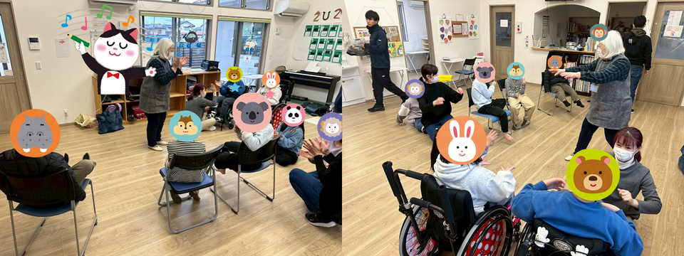2月25日にミュージック・ケアを行いました。今回は鳴子や鈴、スカーフを使って楽しく取り組みました。リズムに合わせて鈴や鳴子を鳴らしたり、スカーフを動かしたりして楽しんでいました