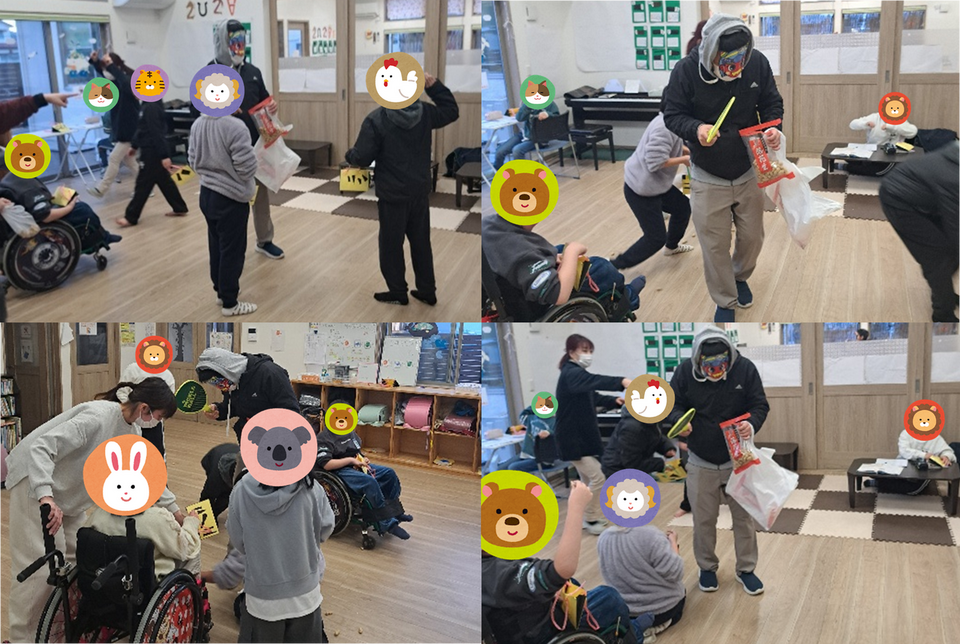 2月3日に、節分で豆まきをしました!「鬼来るかな」「豆いっぱい投げるぞ」など、期待と少しのドキドキが混ざった様子が見られました!!鬼が登場すると、驚いて先生の後ろに隠れる子もいましたが、勇気を出して力いっぱい豆を投げ始める姿が見られました!鬼が退散すると、ほっとした表情で「やったー!」と喜ぶ声があちこちから聞こえてきました!