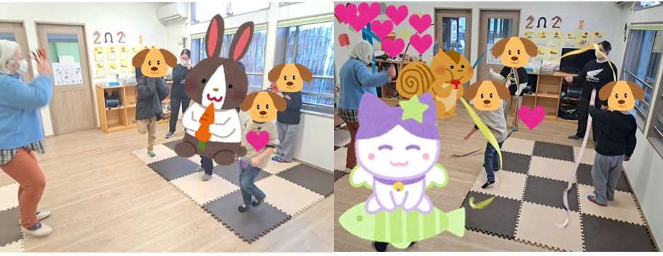 1月21日(水)ミュージックケアの様子です。身体を上手に使って片足立ちしたり、鳴子やリボンを用いて音楽に合わせて道具を動かしたりと、楽しんで活動を行うことができました!