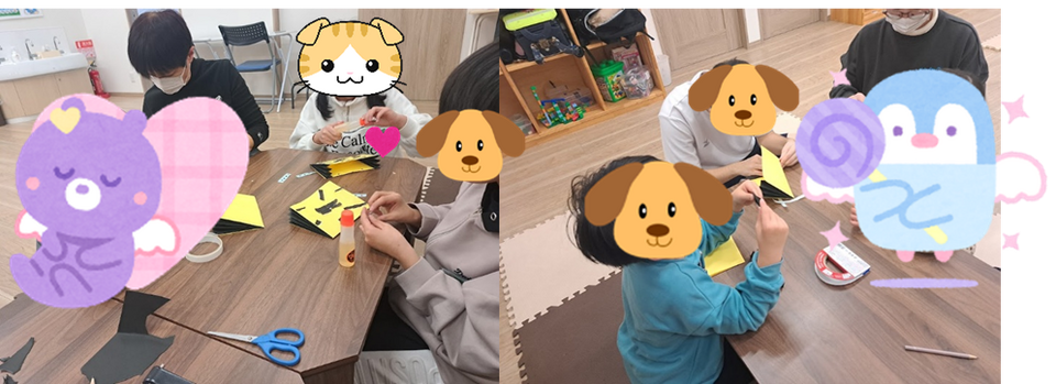 1月27日(火)制作活動の様子です。画用紙や折り紙を使って、節分で使うトラ柄の豆入れバッグを作りました。画用紙を蛇腹折りにしたり、折り紙をちぎって貼り付けたりして、一生懸命制作に取り組んでいた子ども達でした!